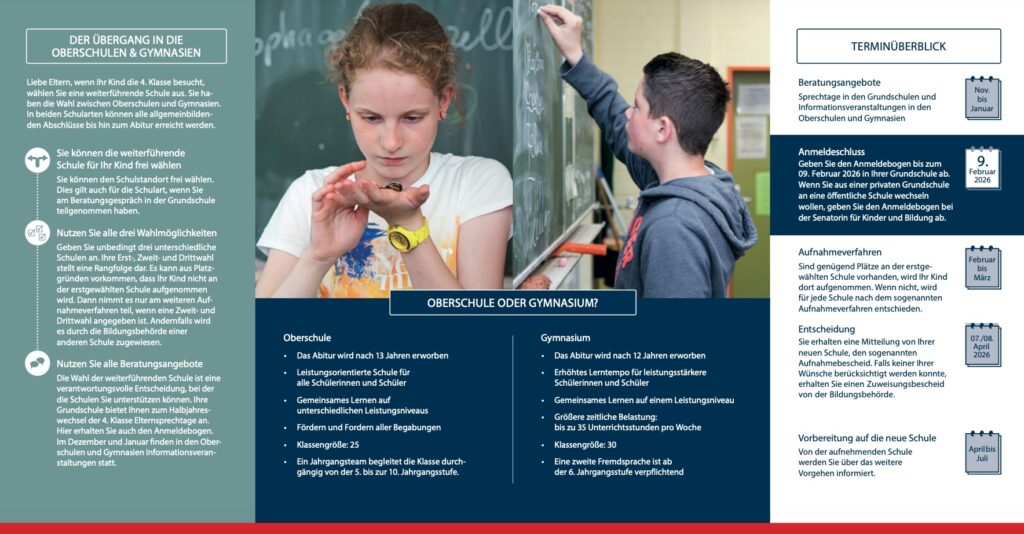 Unter folgendem Link erreichen Sie die Website der Schulbehörde. Dort können Sie sich die aktuelle Broschüre zum Übergang von 4 nach 5 herunterladen. Jedes Kind erhält sie jedoch auch in analoger Form durch die Klassenleitung.