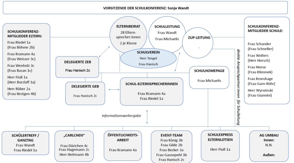 Unsere Teams Das SchulteamSchulleitung, pädagogisches Team, ehrenamtliche MitarbeiterInnen hier klickenEngagierte ElternElternbeirat, weitere Teams, Schulvereinhier klicken Organigramm Unser Organigramm offenbart die innere Struktur unserer Schulgemeinschaft und gibt Aufschluss über die Besetzung und Kooperation wichtiger Gremien sowie Funktionsstellen an unserer Schule. Stand November 2025